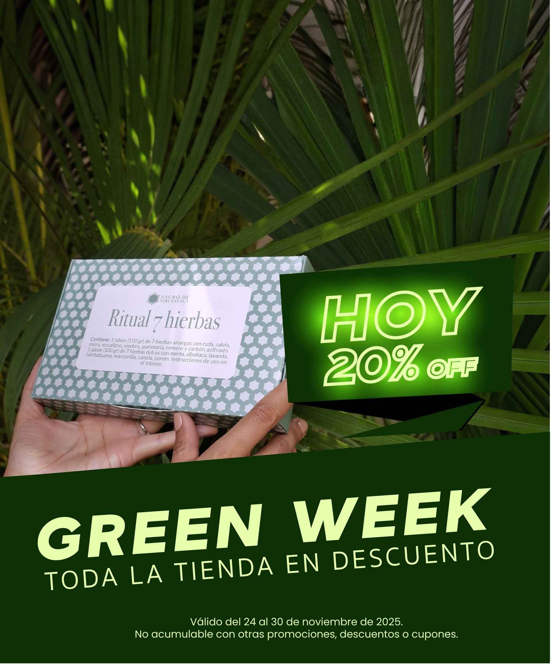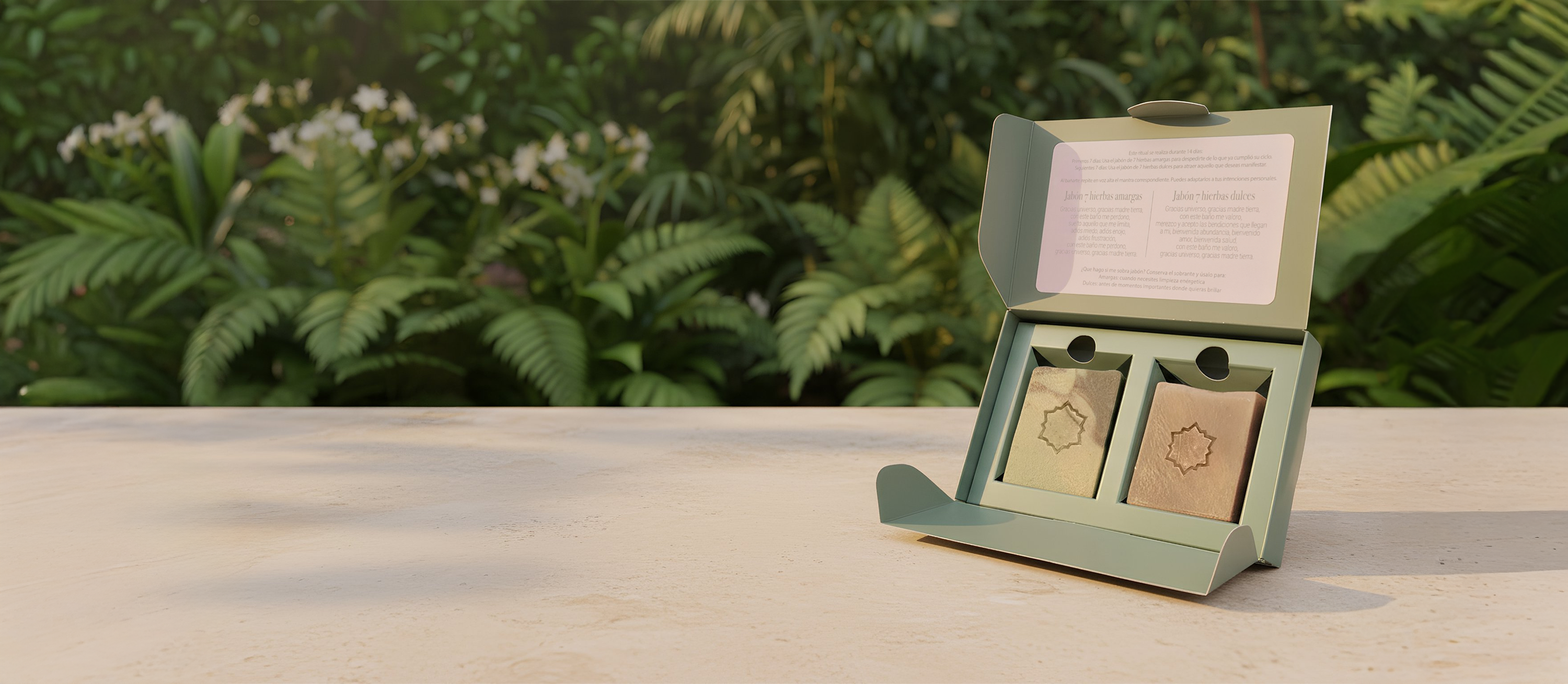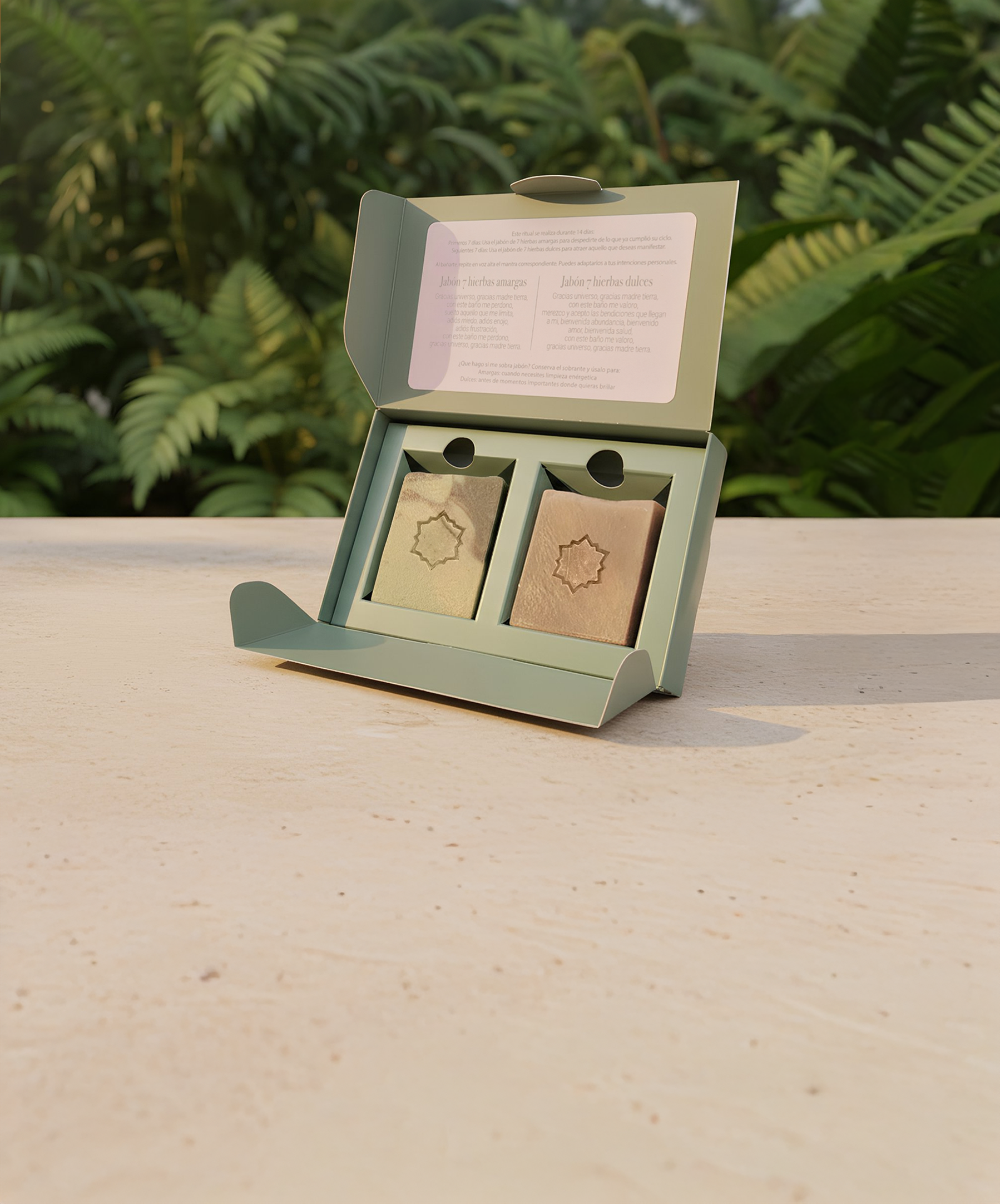 Ritual 7 Hierbas: Este kit ritual de 14 días es tu recarga energética en una caja: durante 7 días usas el jabón de hierbas amargas para liberar conscientemente todo lo que cumplió su ciclo - relaciones, patrones mentales y cargas emocionales que ya no te sirven - y en los siguientes 7 días, con el jabón de hierbas dulces, programas tu energía para atraer abundancia, amor y nuevas oportunidades, completando una transformación profunda guiada por mantras específicos que convierten tu ducha diaria en el ritual de autocuidado más poderoso del año.